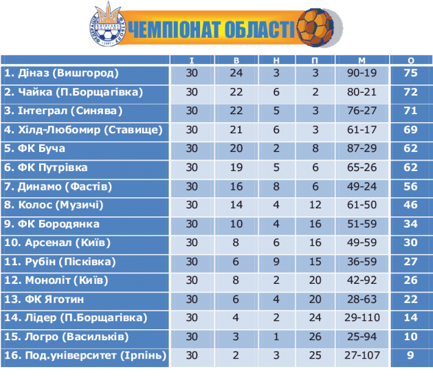 І ще цікавинка. Минулорічний чемпіон — ФК «Путрівка» з Васильківщини — посів у підсумковій таблиці лише шосте місце. Зате став українським віце-чемпіоном серед аматорів. Судячи з усього, саме такими й були турнірні пріоритети путрівців у цьому неабияк захопливому, однак неймовірно складному сезоні. Схожий висновок стосується й бучанців…