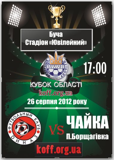 Фінальний матч Кубка Київської області 2012 року між командами «Діназ» (Вишгород) – «Чайка» (Петропавлівська Борщагівка) відбудеться в неділю, 26 серпня, на стадіоні «Ювілейний» в місті Буча.