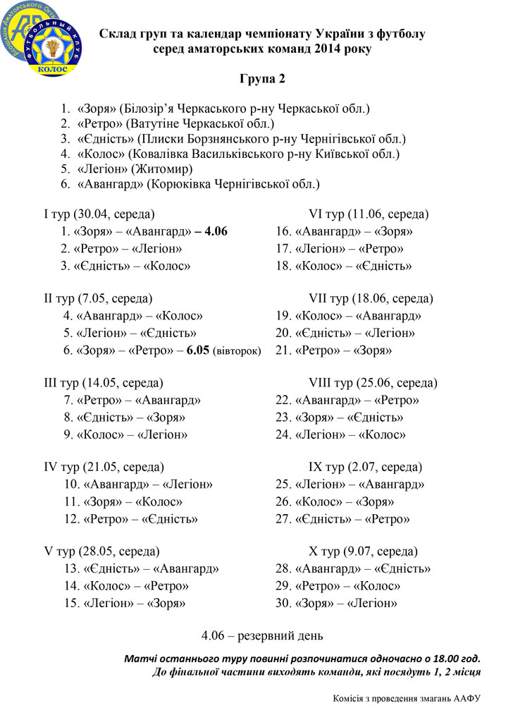 Наводимо склад і календар двоколових змагань у другій групі.