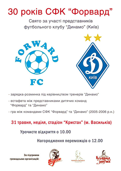 Завтра на стадіоні «Кристал» у Василькові відбудеться святкування ювілею тамтешнього дитячо-юнацького футбольного клубу «Форвард».