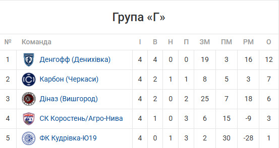 ГРУПА «Г». ФК КУДРІВКА-Ю19 — ДІНАЗ (Вишгород) — 0:21 (Смітюх, 5, 13, 14, 18, 20, 27, Пономаренко, 25, 29, 41, 44, Зева, 38, Сорока, 40, Мартинюк, 48, 76, Величко, 54, 85, Бобіта, 57, 68, 72, Сенько, 78, Федонюк, 89, у свої ворота).